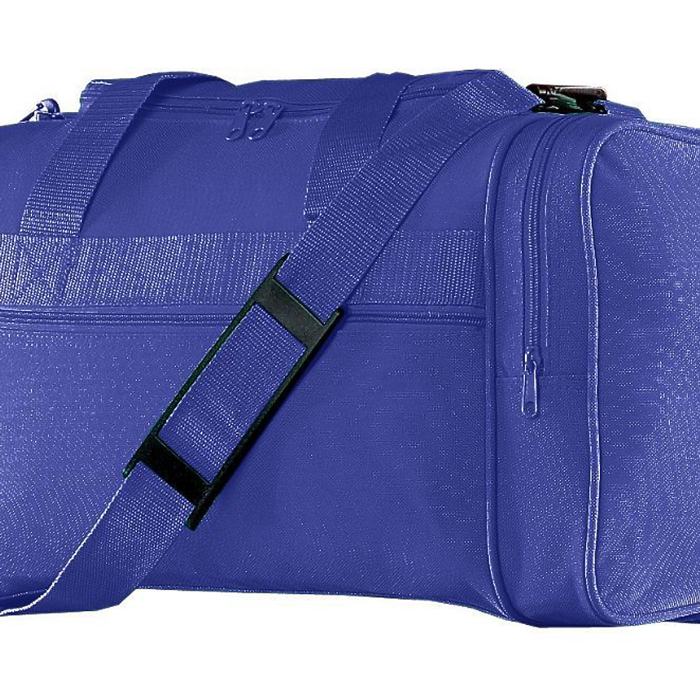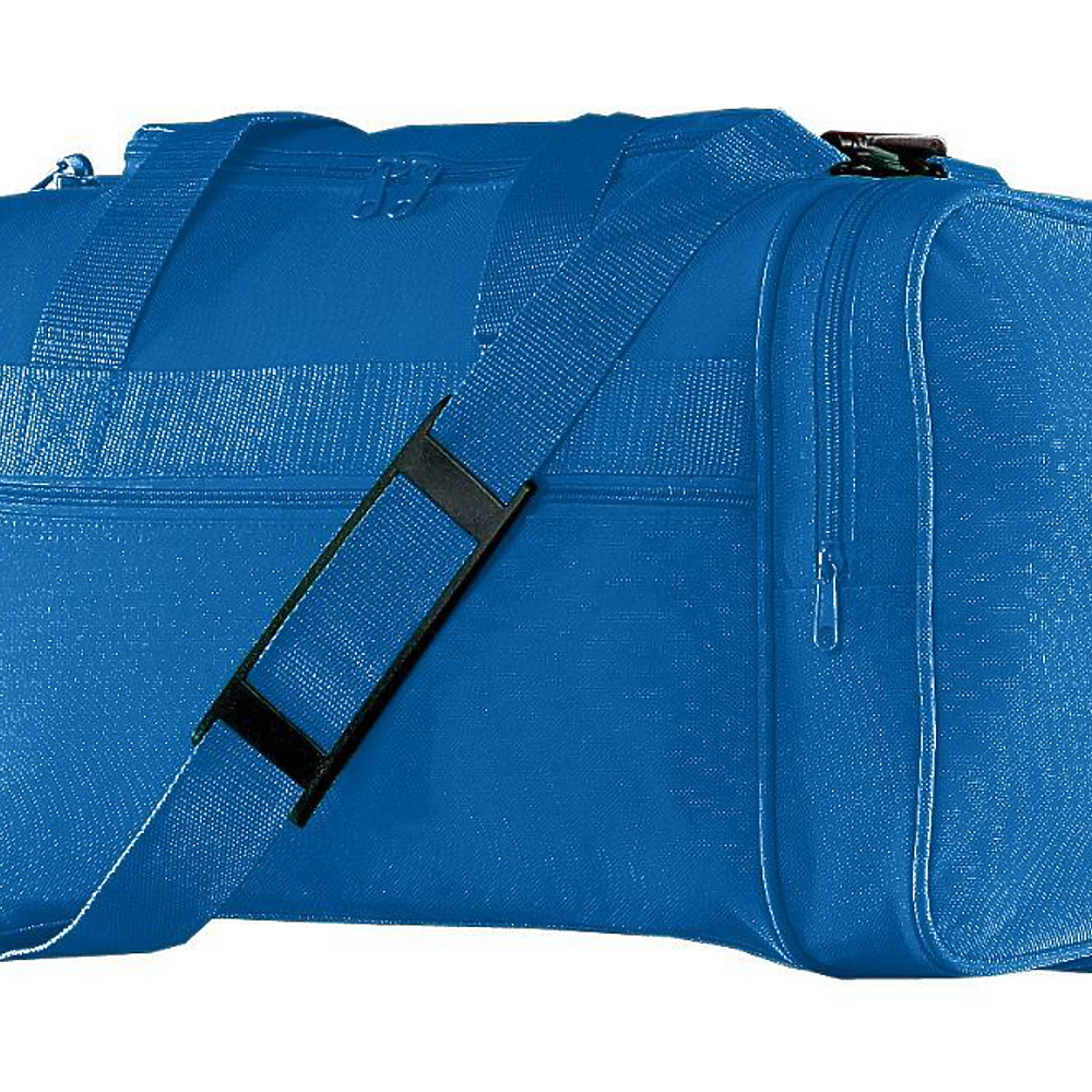 Augusta 600-denier Small Gear Bag. 600-denier polyester with PVC coating. Self fabric piping. Color-matching web handles reinforced at stress points. U-shaped opening with zippered main compartment, separated zippered end-compartments. Removable inside bottom board. Detachable matching shoulder strap with black shoulder guard.
