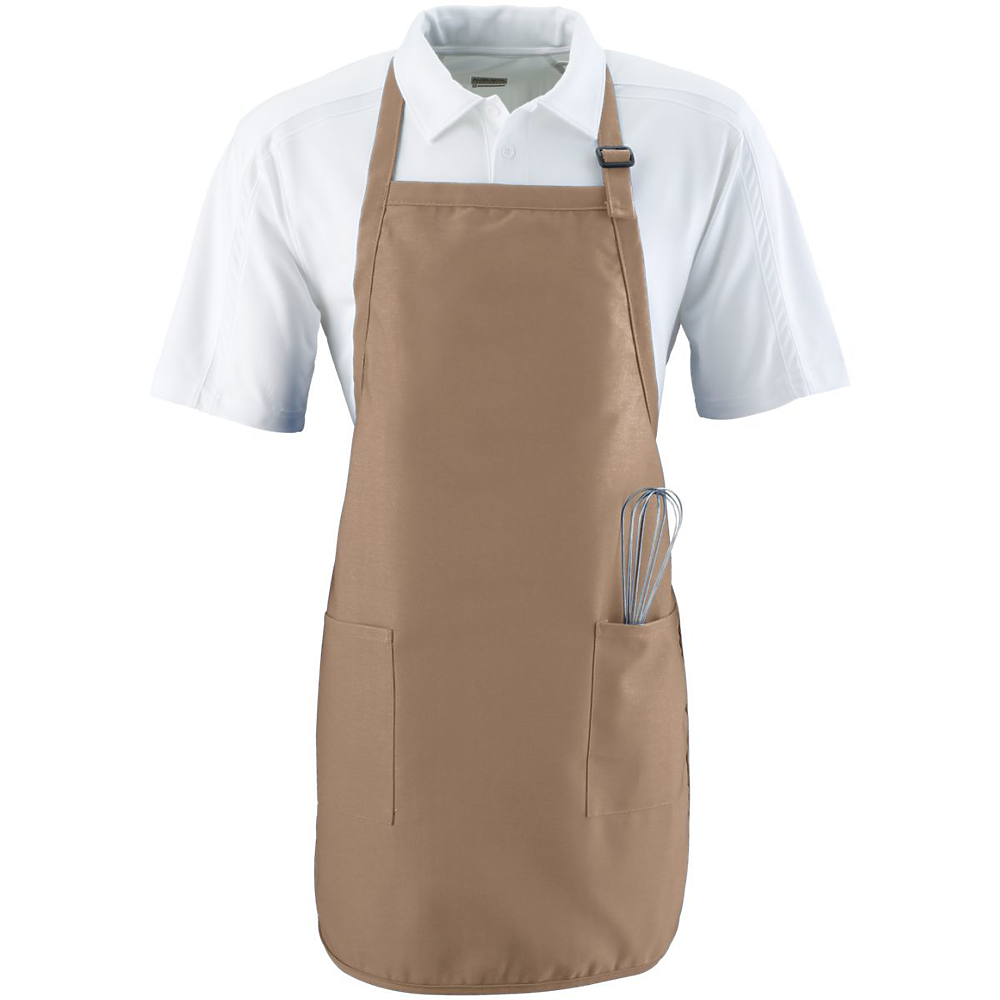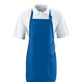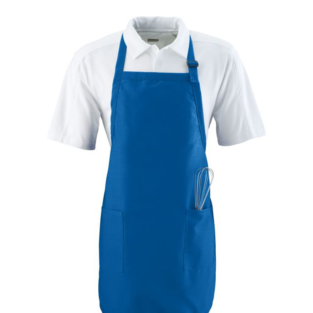 Augusta Twill Fabric 65/35 Poly/Cotton Twill Full Length Apron with Pockets. Restaurant style apron. Two patch pockets. 1 wide neck strap with sliders adjustments. Rounded bottom with self-fabric binding. 1 wide waist ties. Ships from Grovetown, GA.
